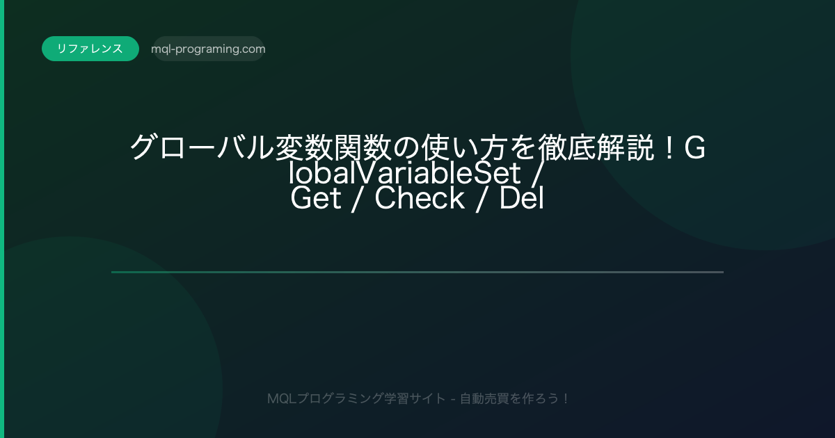 | **タイトル** | 【MQL4】グローバル変数関数の使い方を徹底解説!GlobalVariableSet / Get / Check / Del |